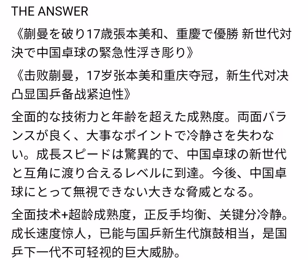 最讓日本球迷狂歡的,是張本美和打破的一項塵封紀錄。她以17歲272天的年齡,超越法國天才小勒布倫,成為WTT冠軍賽歷史上最年輕的冠軍,這一紀錄不分男女,足以見得這份成就的含金量。《東京桌球新聞》更是直接喊出「日本桌球黃金一代誕生」的口號,將張本美和視作「新女王候選」,認為她距離世界乒壇的頂尖寶座,僅一步之遙。