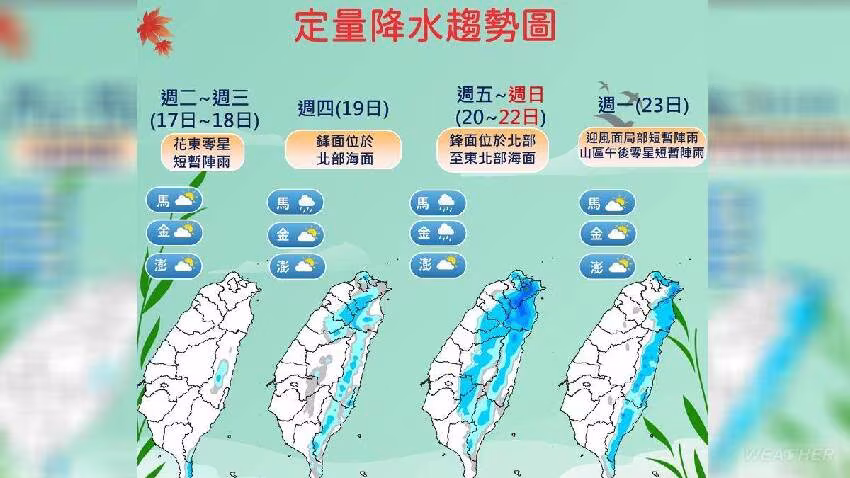 周五(20日)至周日(22日)鋒面位於北部。