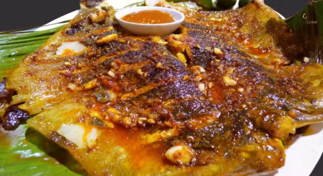 3)烤盤放壹張錫紙,再放壹張香蕉葉,把魚放上去,再淋上已炒好的醬汁,然後蓋上壹張錫紙,放進烤箱烤25分鐘既可。
