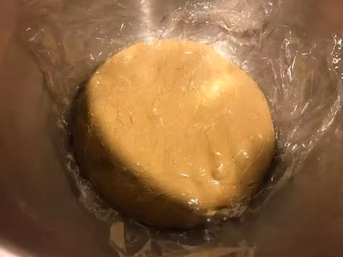 5.麵團醒發好以後,將醒發好的麵團掰成細碎的小塊,加入少量椰漿和剩下的紅糖水。用廚師機或者攪拌棒將所有食材均勻攪拌成糊狀,攪拌成圖片上的狀態即可。