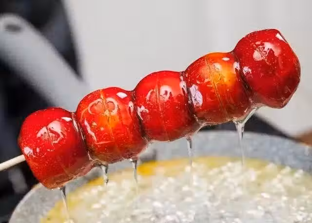 冰糖葫蘆的做法其實也很簡單,只要掌握好炒糖色的火候就能成功。全程小火用冰糖慢慢熬制,等到融化變顏色後不停攪拌,快變成棗紅色時關火,用炒鍋的餘溫再不停的炒制,知道冒煙後放入穿好串的山楂,裹滿冰糖即可,放到室外幾分鐘就能成型,味道酸甜開胃,小孩子最愛吃了。