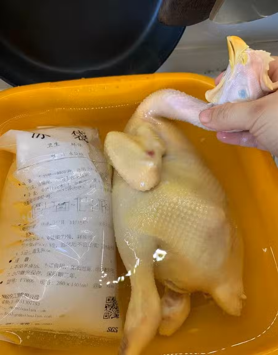 5、再把雞肉放進鍋里煮20秒,放進冰水裡泡10秒,這個動作重復做3次,這是白切雞皮脆肉嫩的關鍵步驟。
