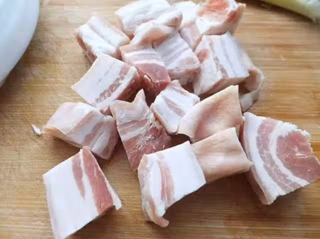 3、五花肉泡好後洗凈,放在熱鍋上燙一下豬皮,然後洗凈切成2公分寬的肉塊。燙一下皮,五花肉能快速燉爛。