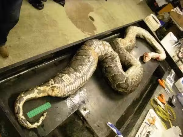男子再次返回時,在同樣的地方看到了同樣的巨蟒,這麼久了巨蟒還在引起了男子的注意,男子認真的觀察巨蟒,發現巨蟒的體型很大,腹部哪尤其的明顯,男子在車裡等著,發現那巨蟒一點都沒有動靜,男子猜想會不會被來往的車壓死了,這才敢下車查看。
