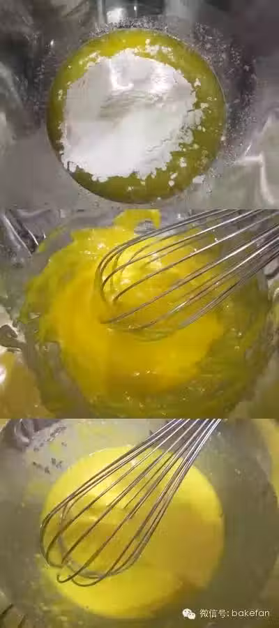 在一個無水無油的盆裡,打散蛋白,加入砂糖。打至細膩起泡開始蓬鬆後,加入剩下的砂糖。