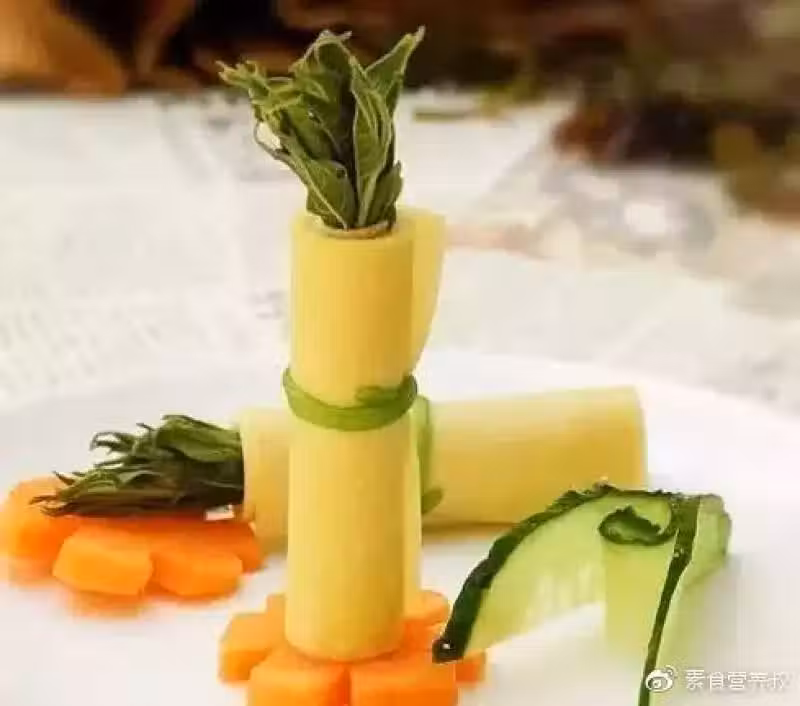 8、依次把所有的豆皮卷都做好,碼在碟子內,為了美觀也可以切一些胡蘿蔔花作為點綴。