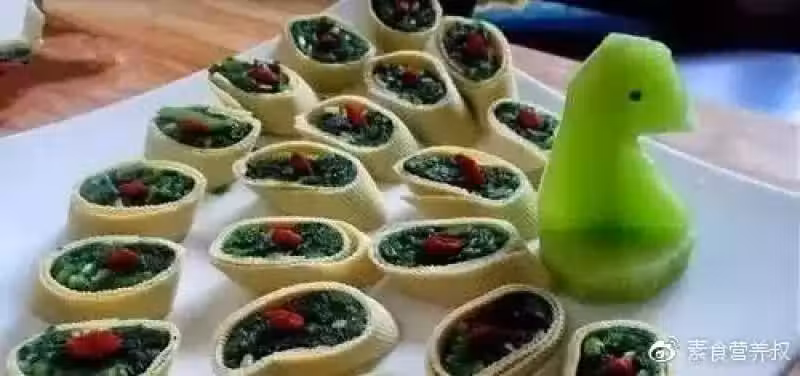 2、把菠菜放入豆腐皮內捲起來,然後切成2等份,用香菜捆綁緊。