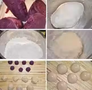 3、紫薯餡、糯米團分成相同數量的等份,團成小球;