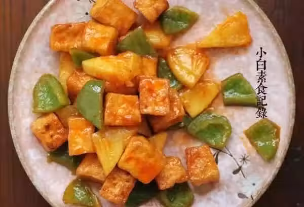 3、將蕃茄醬、糖、鹽、澱粉和水混合調成汁。鍋燒熱下少許油,下調好的汁炒勻,然後下入青椒和菠蘿翻炒一會,接著下入豆腐一同翻炒,讓調料汁均勻裹在菜上即可。松仁玉米