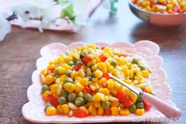 食材:1根新鮮玉米、50g 松仁、1根青椒、1根紅椒、2個小米椒、3g鹽、3g糖、3湯匙牛奶。
