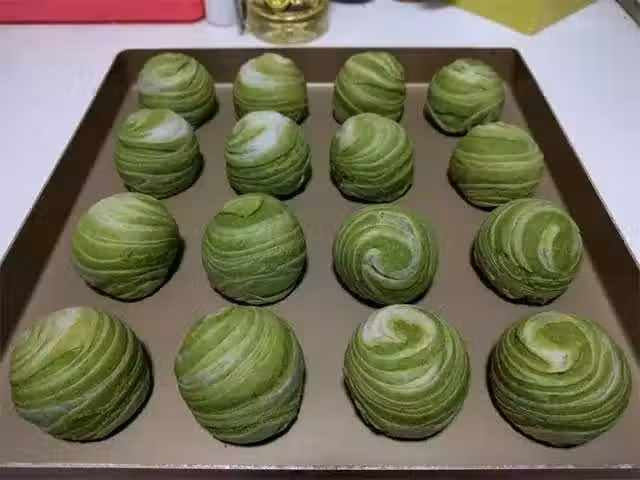 油皮:中筋麵粉151g,食油57g,糖粉18g,水82g 油酥:低筋麵粉123g,抹茶粉5g,豬油75g 內餡:鹹蛋黃16個,豆沙餡320g。