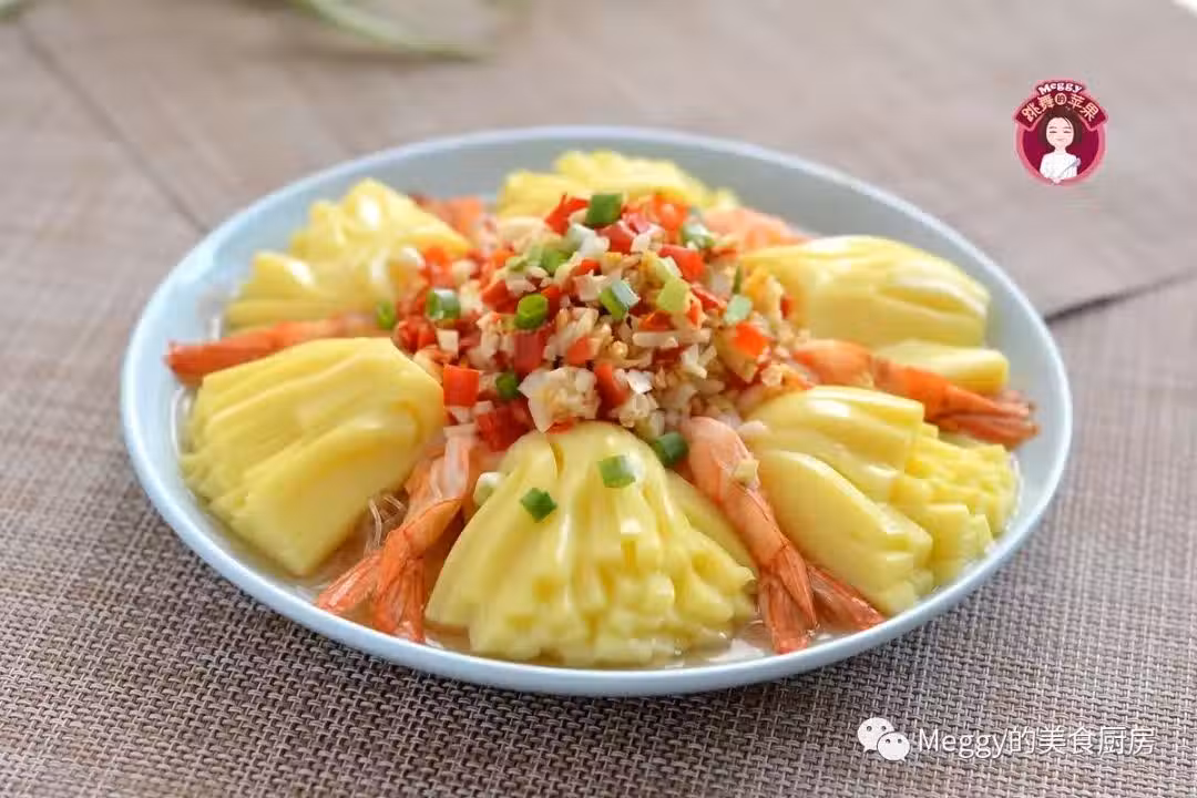 這道蒸菜低脂少油,造型美觀,雍容大氣,顏色鮮艷;蝦肉香彈,玉子豆腐嫩滑,粉絲筋道入味;做法也簡單,蒸8-10分鐘可出鍋,取名「富貴滿堂」或「花開富貴」討口彩。