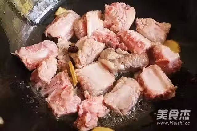 5.加入適量米醋,米醋的量浸過排骨即可,轉小火,蓋上蓋子,慢慢燜。