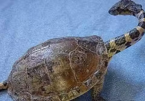 但接下來發生的事情就不像他想的那麼好了,他興高采烈拿著肉去喂烏龜的時候,它突然伸出腦袋來,它不伸還好,一伸把這男的嚇個半死!這隻烏龜伸出的頭卻十分不一般,它的脖子特別長,脖子上面滿是花紋。一看,還以為是一條蛇寄居在了烏龜殼裡,但旁邊的四肢又騙不了人。