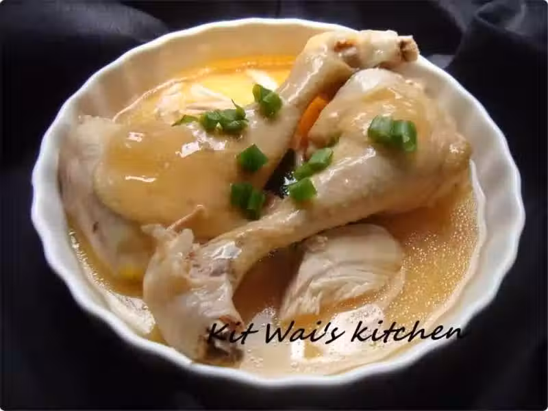 3) 然後把雞腿放入沸水裡煮3分鐘才熄火,讓雞腿在鍋裡燜熟45分或至熟.