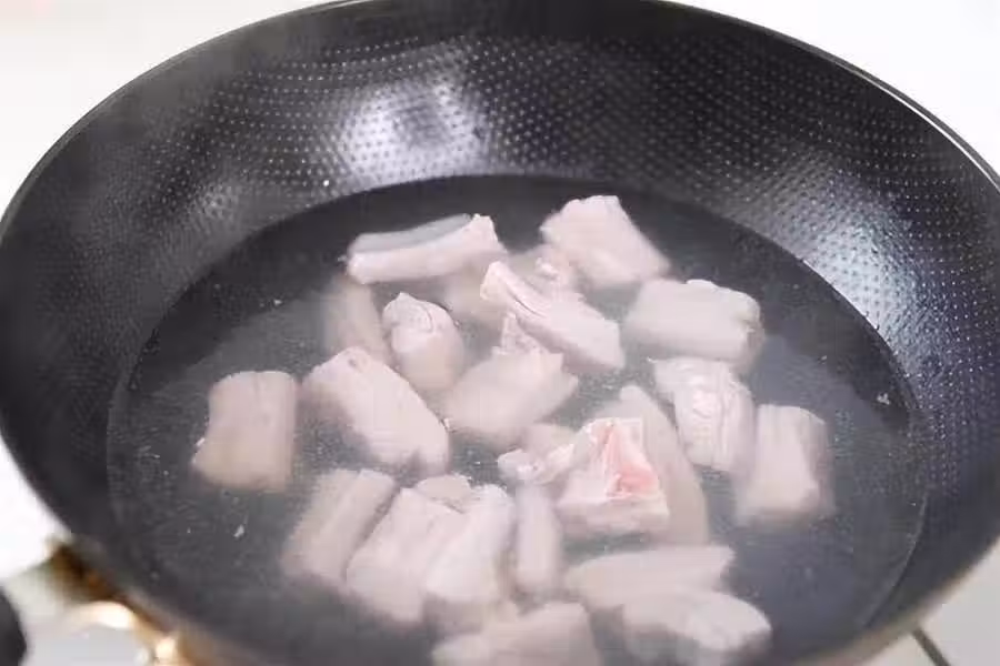 這時候,就要把豬肉放進清水裡浸泡一個小時,把裡面的血水和雜質浸泡出來。浸泡時要記得加一點食鹽,用淡鹽水浸泡,中間換一次水,這樣豬肉里的血水和雜質才能完全浸泡出來。