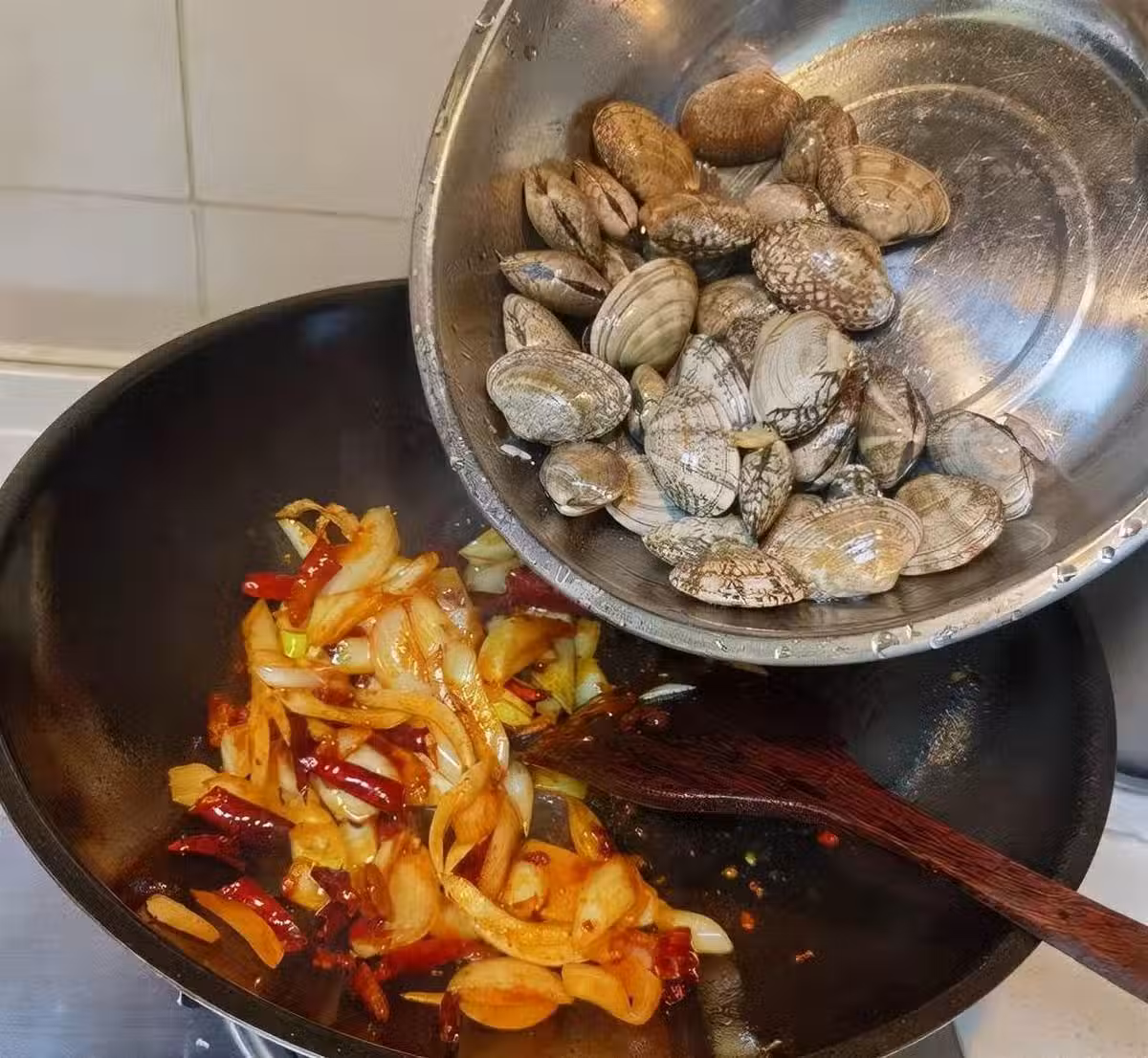 接著就可以起鍋了,先往鍋中鋪上幾片薑片,然後將花甲鋪到薑片的上面,再將料酒倒入鍋中,然後蓋上鍋蓋燜1分鐘,這一步有很好的去腥作用,燜了之後花甲就開殼了,就可以先把花甲盛出備用。再接著往鍋中加入適量的底油,然後把切好的姜、蒜末放進油鍋中,先把油炒香,根據口味可以往鍋里放入幾顆干辣椒,然後就可以將我們的花甲倒入鍋中進行翻炒,再加入適量的生抽醬油調味提鮮,接著進行翻炒,讓鍋里的醬油和花甲能夠調配均勻。
