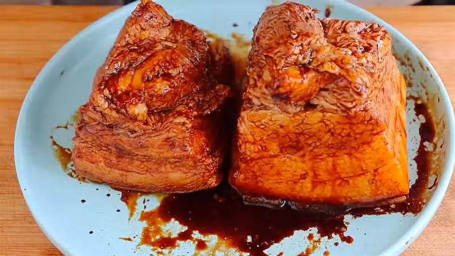 6。十分鐘過後,我們用筷子插一下五花肉。能夠輕鬆的插透,就代表五花肉已經煮好了。然後將其撈出。在一個盤子中倒上生抽一勺老抽一勺,將晾好的五花肉放在生抽裡面塗抹均勻。