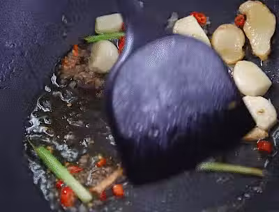 3、起鍋倒入香油和少許食用油,油熱倒入薑片煎至微焦。