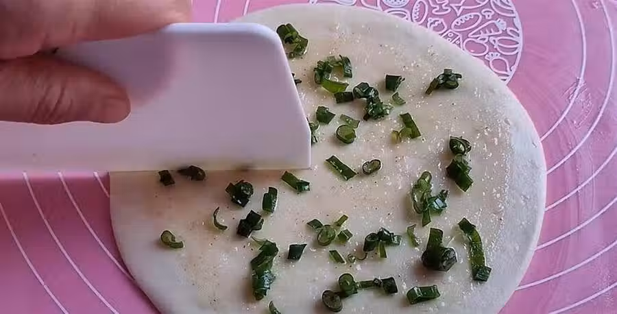 12.在表面刷上一層油酥,再撒點蔥花。用刮刀在半徑處切一刀。