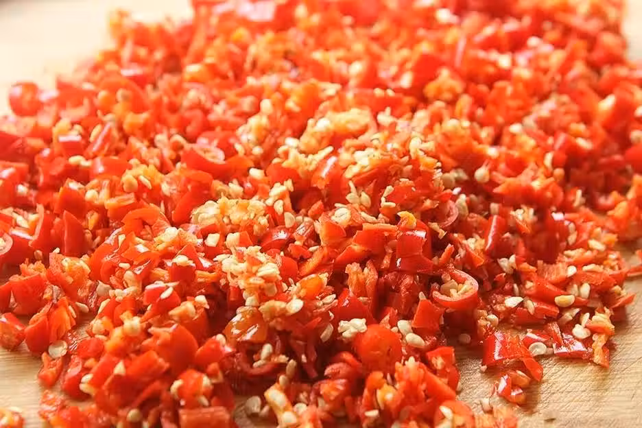 2、辣椒洗凈水分控干(製作過程容器等都要保持干凈無水的狀態),瀝干水後把綠色的蒂去掉再剁碎或者機器打碎,剁辣椒的時候建議帶上一次性手套,要不弄到手會很辣的!