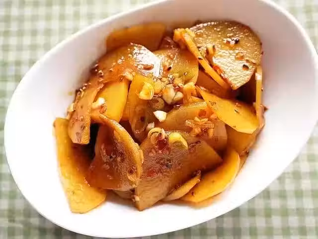 撈出煮好的土豆片,立即放入冰水中浸泡冷卻,然後撈出瀝干。加入準備好的佐料拌勻,最後撒上炒香的白芝麻即可。
