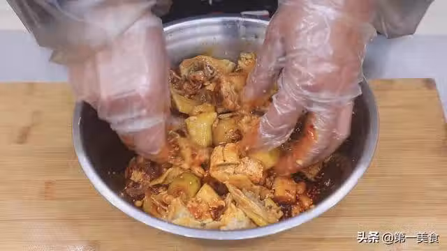 我們把晾涼的麻雞取出來,剁成均勻小塊,放入料汁裡面抓揉一會,再撒入適量的花椒麵,繼續抓勻 就可以食用了。