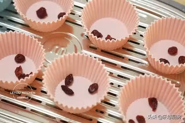 第五步:取幾個矽膠模具放到蒸籠上,再往模具里撒一些蔓越莓干,如圖。