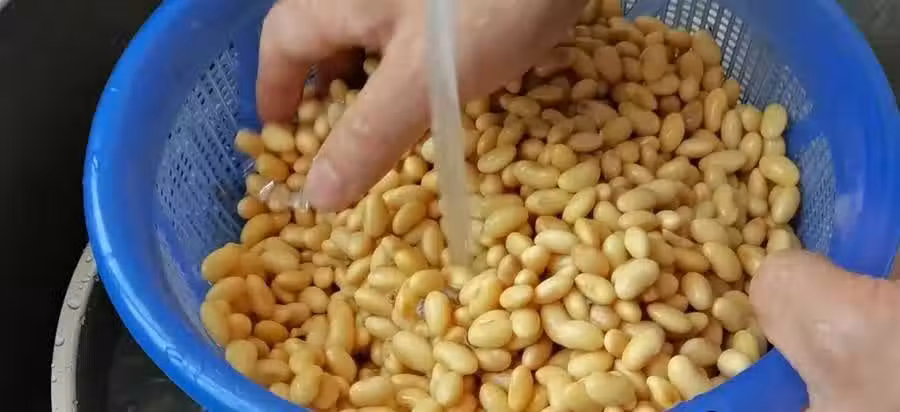 2:洗干凈後,放入鍋中,加入足量的清水,再加入一點食用堿(這樣可以使黃豆更益煮爛)大火煮開後,打去浮末轉小火煮上一小時,將豆子煮爛。