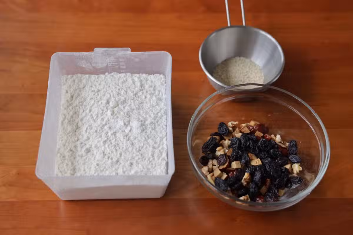 4、準備一個深一點的模具,鋪上油紙備用。再把混合的果乾一半灑在模具里。
