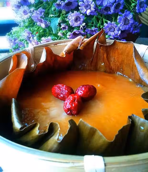 4.放入蒸鍋大火蒸2小時以上(我的是6寸圓模放電飯鍋裡蒸的,兩個半小時剛好)。有人說放高壓鍋裡蒸半小時搞定。因家裡沒高壓鍋就無法給你證實了。。(具體看下麵小貼士)