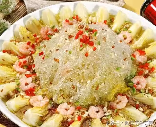 4、泡軟的粉絲鋪在盤底,擺放娃娃菜