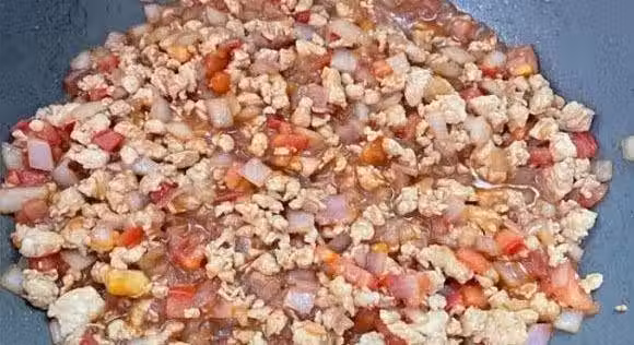 第五步:熱鍋中放一張全麥卷餅,稍稍給它煎到兩面金黃,然後先在上面鋪一層我們提前搗碎的土豆泥,再鋪上我們做好的雞胸肉番茄醬,最後上面給它鋪上兩片芝士,折起另外一半給它對摺蓋上。