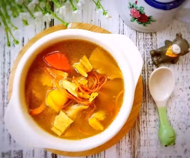 2. 山藥和蓮藕快熟後再放入腐竹、猴頭菇、蟲草花及油、鹽,然後燉個十分鐘就好了。