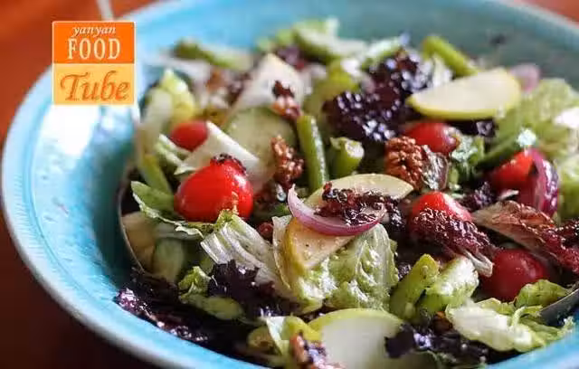 1、將所有蔬菜洗凈甩干水分,切好備用;2、把蘆筍撒上少許鹽和橄欖油,平底鍋加熱不放油,用大火將蘆筍煎1分鐘備用;3、把所有蔬菜、水果和乾果放在一個特大號的大碗裡;4、在量杯里把青檸、薄荷、鹽、黑胡椒、橄欖油、醋攪拌均勻至乳化;5、把油醋汁到在蔬菜里拌勻即可。