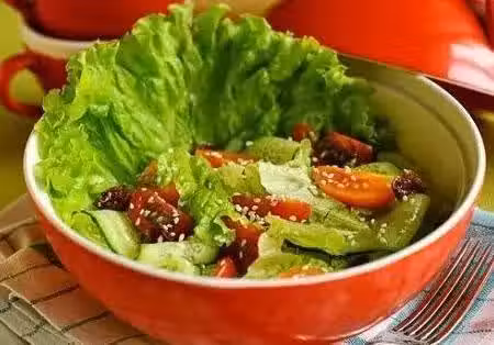 花葉生菜1棵,聖女果(雙色)10個,黃瓜1根,沙拉汁30ml,白芝麻3克,蔓越莓適量