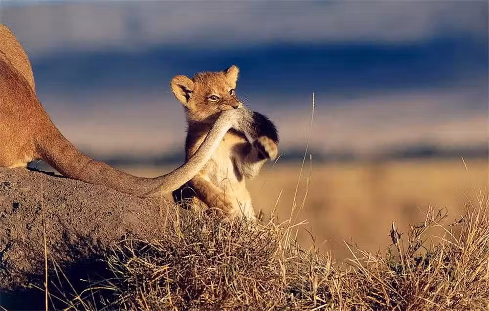 母獅外出覓食,帶著捕獵的食物正回家為自己的寶寶餵食,走到自己的地盤