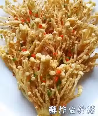 5. 炸好的金針菇撈出瀝油,再撒上辣椒麵,孜然粉,辣椒粒即可。