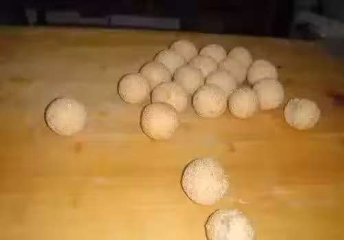 製法:將南瓜蒸熟,搗成泥與糯米粉,白糖,吉士粉,色拉油,混合拌勻,揉至成麵糰,將麵糰下25克面劑,按扁包入豆沙餡,捏成圓形餅坯沾上白芝麻(備用)。