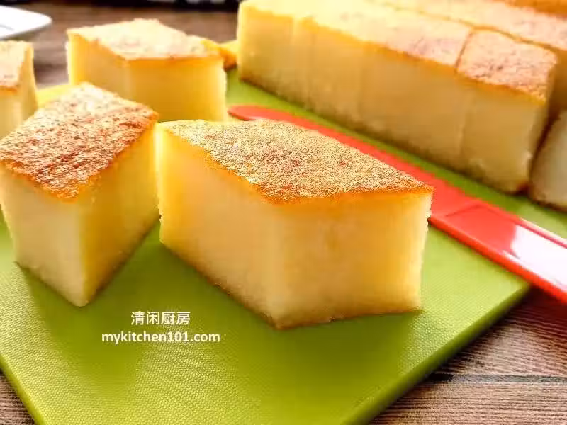 6. 放入已預熱的烤爐,以200°C/390°F烘烤1小時15分鐘,或直到表面呈金黃色。擱置一旁至完全冷卻後才脫模。脫模後,用塑料刀切成小塊