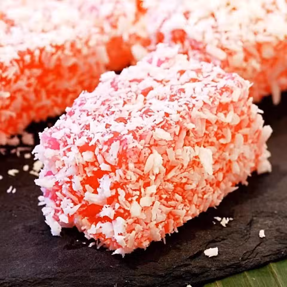 1. 把水倒入鍋中加熱至沸騰。水沸騰後接著加入班蘭葉,細砂糖,西米,玫瑰精和適量的粉紅色色素。煮至西米接近8分熟,西米露中間還有點白點。2. 煮好的西米倒入鋪了香蕉葉和刷了一層油的模具中,用湯匙壓平。3. 接著將西米放入蒸鍋中,將西米蒸20分鐘或是蒸至全熟(西米完全透明就證明蒸熟了。蒸熟的時間還是要依照盤子的大小或是西米糕的厚度決定)4. 蒸熟的西米糕取出放涼後,放入冰箱冷藏40分鐘-1小時。5. 製作椰絲沾料:將椰絲,鹽和水攪拌均勻,放上班蘭葉,放入鍋中用大火蒸5-10分鐘。椰絲蒸好後,放涼備用6. 西米糕冷藏好後,從冰箱取出切塊,最後粘上椰絲即可。