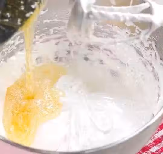 ⑥所有糖漿都倒完後,取出烤箱裡保溫液化的30g黃油,分兩次加入並攪打均勻。