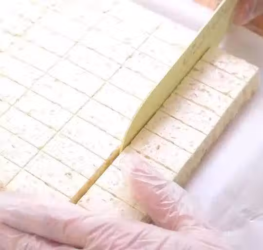 由於牛軋糖是容易受潮發黏的,所以切割好就要立刻包裝密封。而且同理,包裝操作時要注意衛生,並且空氣不能高溫潮濕,否則就要開空調降溫除濕。