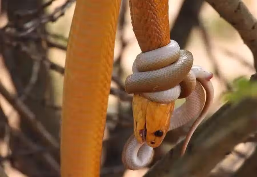 非洲屋蛇裸絞比自己大得多的黃金眼鏡蛇,結果因用力過猛導致「脫肛」