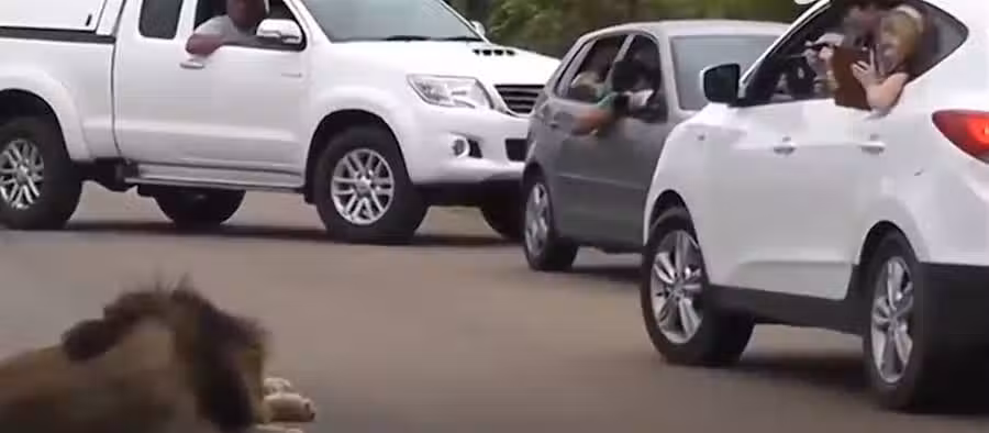 這時,一位女司機覺得視角不好竟然探出頭來拍照,俗話說不作死就不會死,獅子似乎慢慢察覺到了異樣,憤怒起身,清醒過後對著那名女子就是一陣獅吼,突然的吼叫嚇壞了這名女子趕緊縮回車中。之後就將所有的窗戶關閉車門緊鎖,獅子卻向車身走去,只見它走到車的後方,竟然一口咬住了車的尾巴。