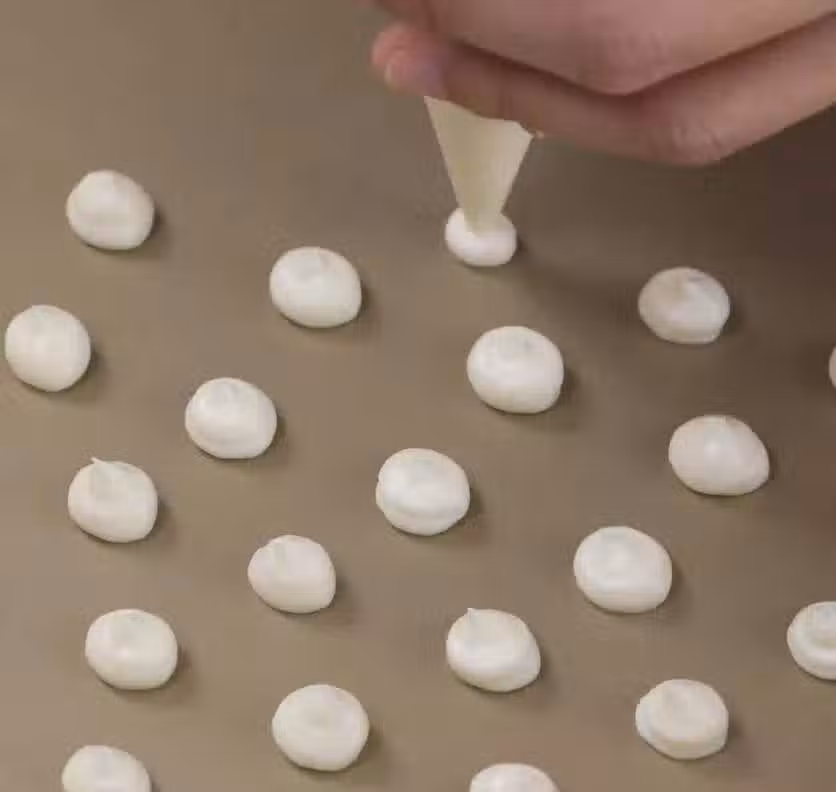 在烤盤上按2倍間隔,擠出直徑約1.5厘米,高1厘米的小水滴,如果妳的烤盤是不粘的,可以直接擠在烤盤上,否則就必須墊油紙。