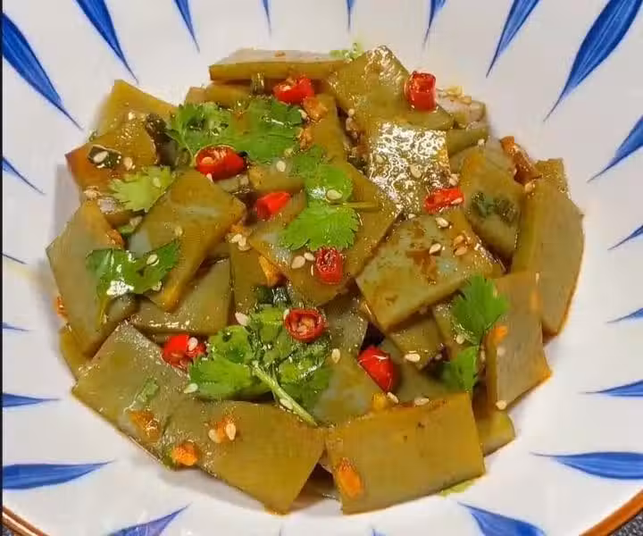 4、這個時候把晾涼的這個石蛋給它切成均勻的薄片放入碗中,再把這個料汁都倒進去,再來點兒香菜給它攪拌均勻,裝盤就可以開吃了。