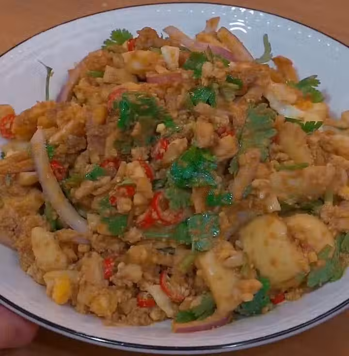 煮熟的雞蛋去殼,全部搗碎,加蒜末、小米辣、洋蔥、香菜、生抽和香油拌勻,簡單好吃又下飯。