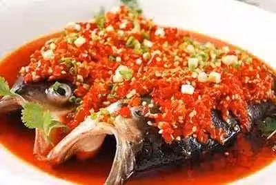 4、放入魚頭,再均勻的碼上剁椒。