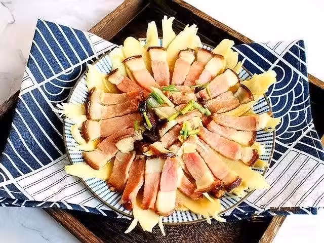 5、 另將一片冬筍和一片臘肉相間隔的擺放在冬筍的上面;